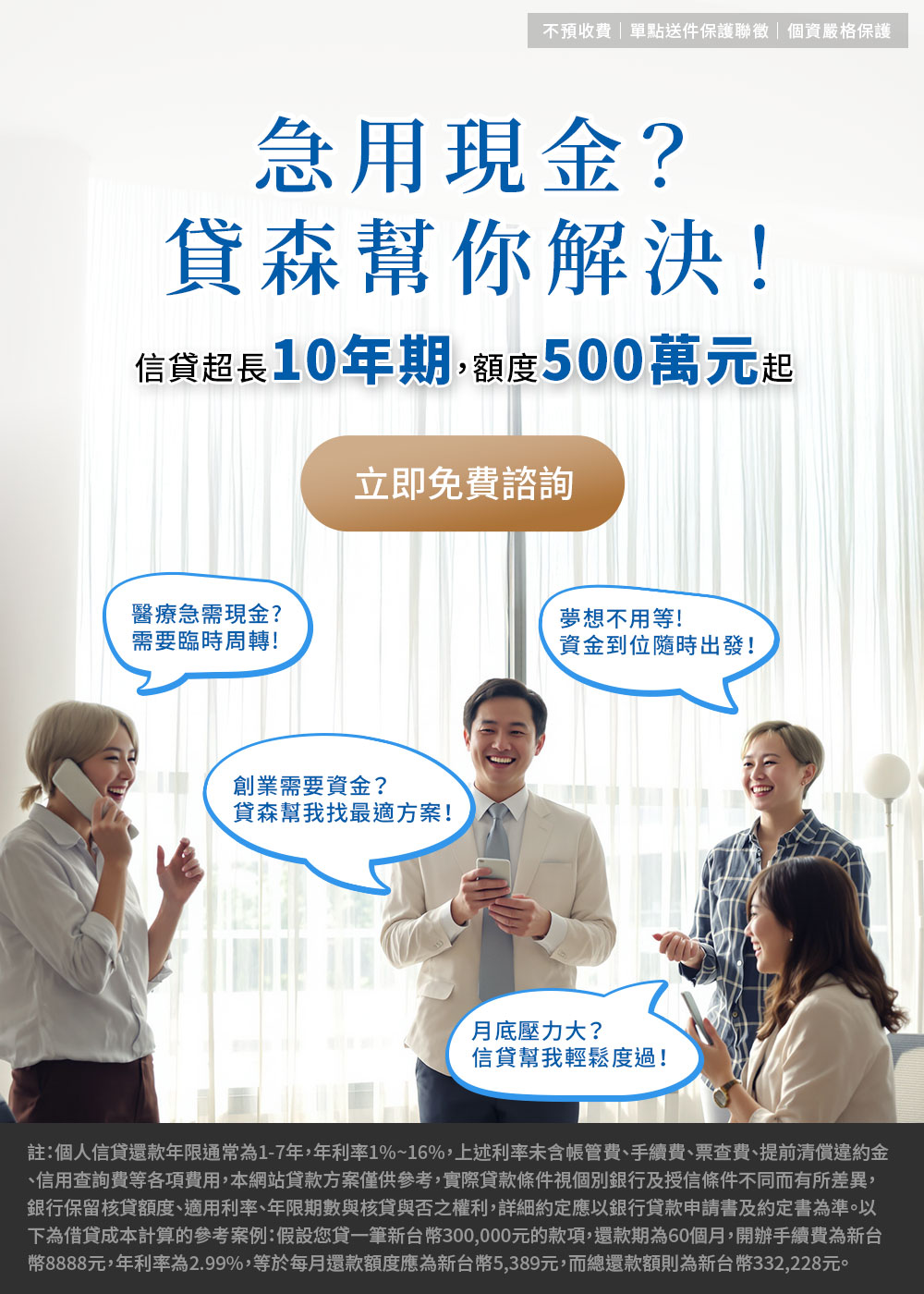 所有方案不預收費、個資保護,詳情請填單諮詢。