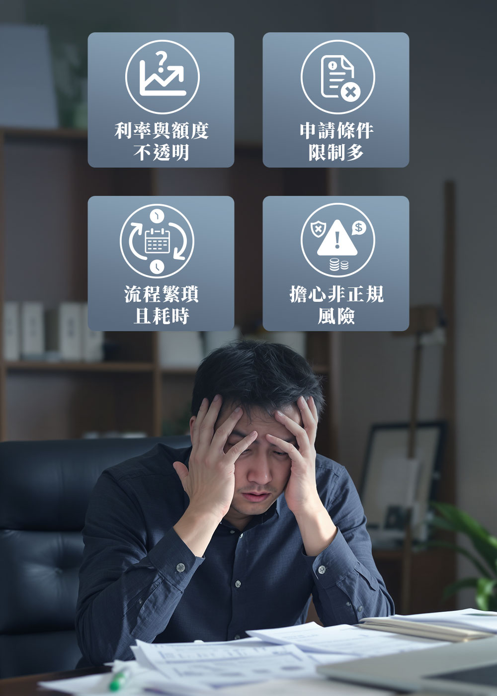 陳小姐因創業和生活開銷,累積了多筆高利率的信貸與卡債,每月還款讓她喘不過氣。她想用名下房產辦理二胎整合債務…